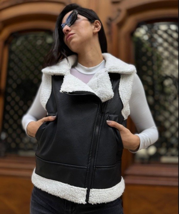 Chaleco estilo gamulan, eco cuero con corderito. Talle L/XL