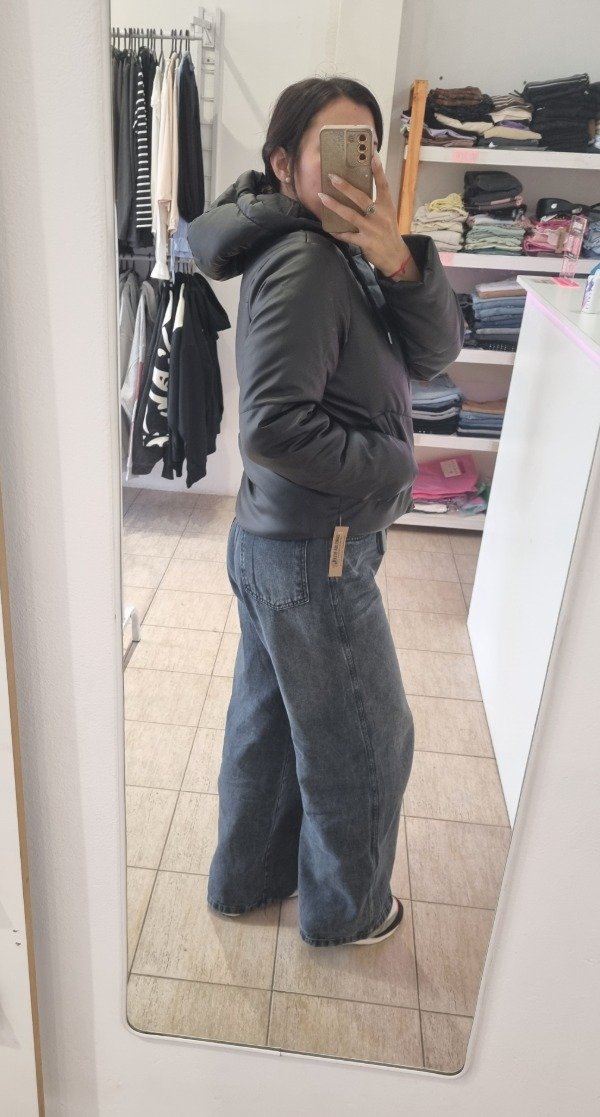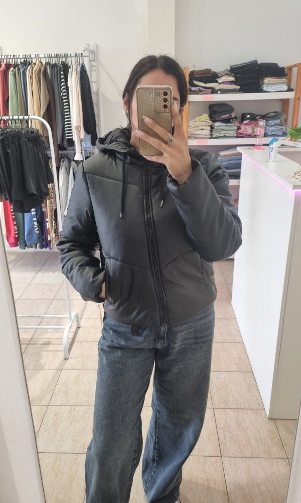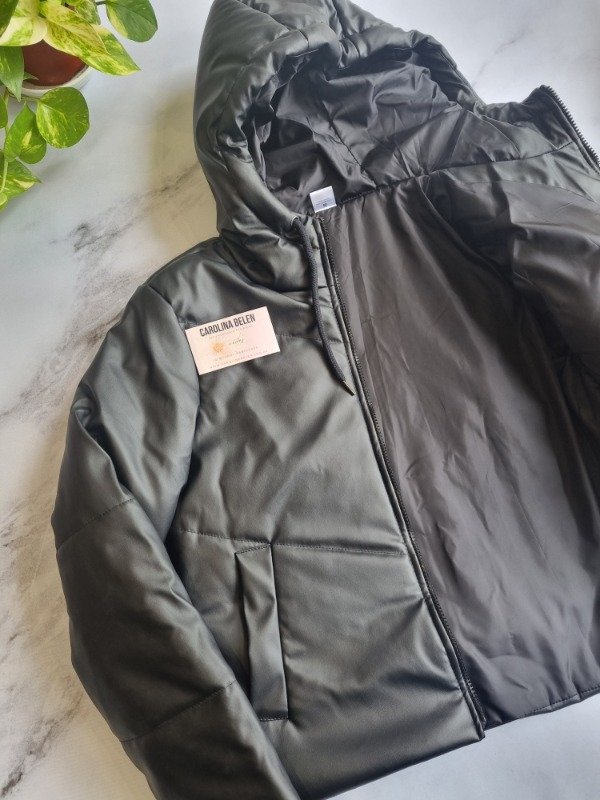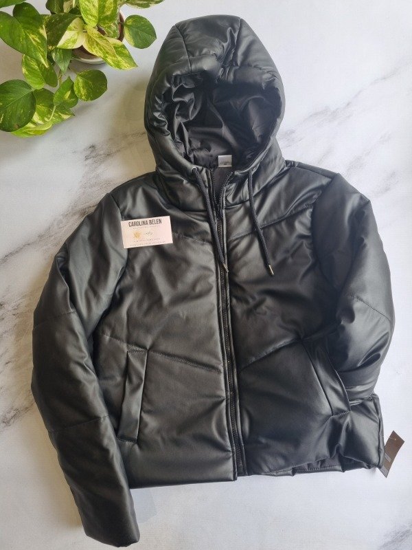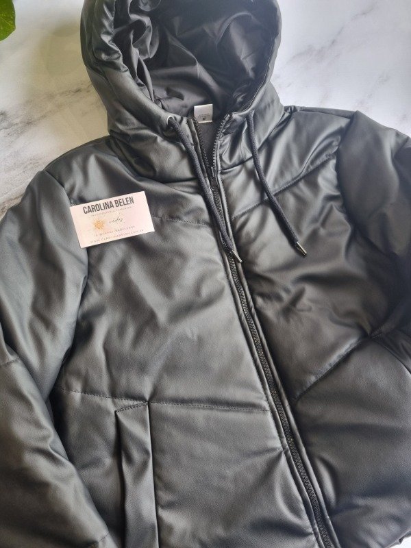 Campera puffer eco cuero con capucha. Talle cumplido
