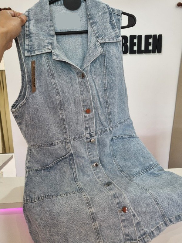 Vestido de jeans con boton y bolsillos, rigido talle real. Arriba de las rodillas